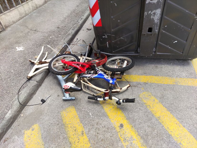 Carcasse di biciclette abbandonate in città in pieno giorno