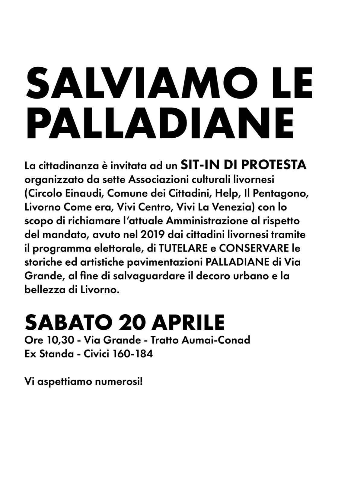 Sabato ore 10,30 via Grande Tratto Conad, civici 160-184 Sabato mattina, alle 10.30, Ti chiedo mezz’ora del Tuo tempo: mezz’ora per partecipare alla protesta contro lo smantellamento previsto da questa amministrazione delle pavimentazioni di via Grande. Mezz’ora per salvare un patrimonio comune e settant’anni di storia… diffondete questo invito a chiunque pensate possa sposare questa…