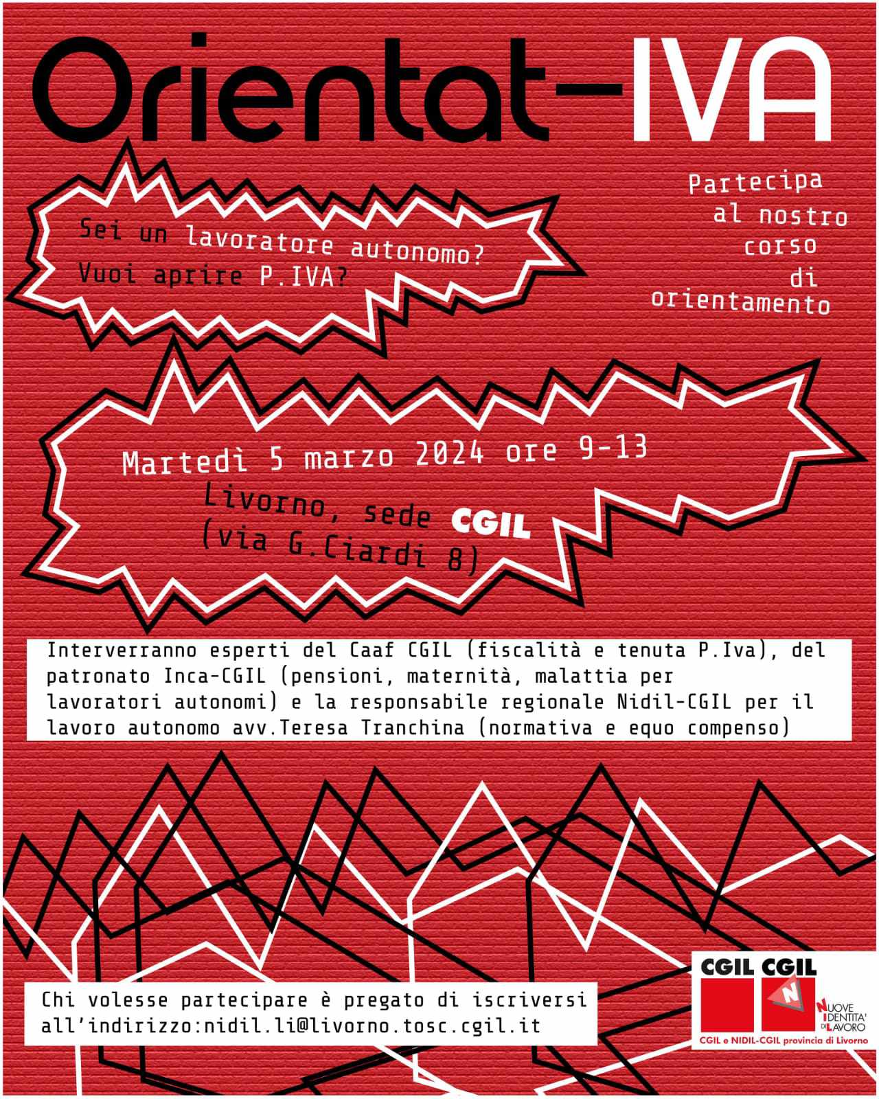 Martedì 5 marzo dalle 9 alle 13 alla sede Cgil di via G.Ciardi 8 Livorno, 29 febbraio 2024 Sei un lavoratore autonomo? Vuoi aprire la partita Iva? Partecipa al corso gratuito di orientamento “Orientat-Iva” in programma a Livorno martedì 5 marzo dalle 9 alle 13. L’iniziativa – organizzata da Cgil e Nidil-Cgil provincia di Livorno –…