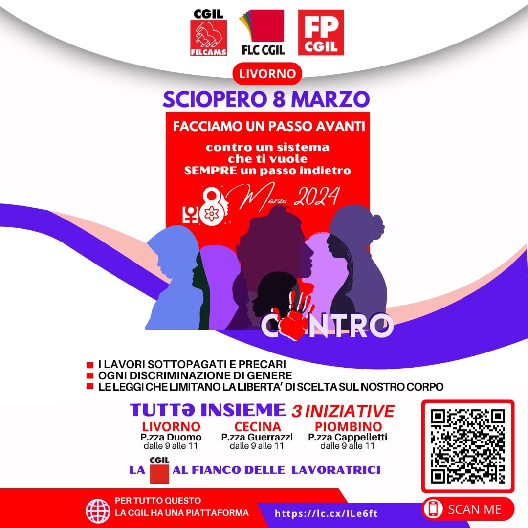Venerdì 8 marzo dalle 9.00 alle 11.oo in piazza Grande al Duomo Livorno, 6 marzo 2024 Per venerdì 8 marzo Filcams-Cgil, Flc-Cgil e Fp-Cgil indicono uno sciopero per l’intera giornata lavorativa e presìdi a Livorno, Cecina e Piombino contro le discriminazioni di genere, leggi che limitano la libertà di scelta sul nostro corpo e contro lavori…