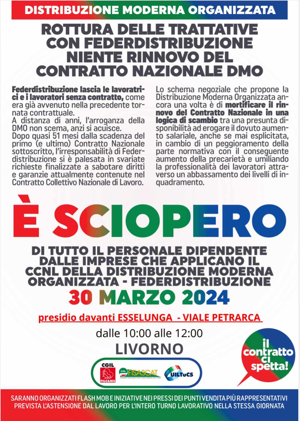 Lavoratori in protesta contro Federdistribuzione per il mancato rinnovo del CCNL (scaduto da 51 mesi) Livorno, 29 marzo 2024 Domani sabato 30 marzo davanti all’Esselunga di Livorno (viale Petrarca) si terrà dalle 10 alle 12 un presidio di lavoratrici e lavoratori della Distribuzione Moderna Organizzata (DMO). La protesta – organizzata dalle segreterie provinciali Filcams-Cgil, Fisascat-Cisl e Uiltucs-Uil…