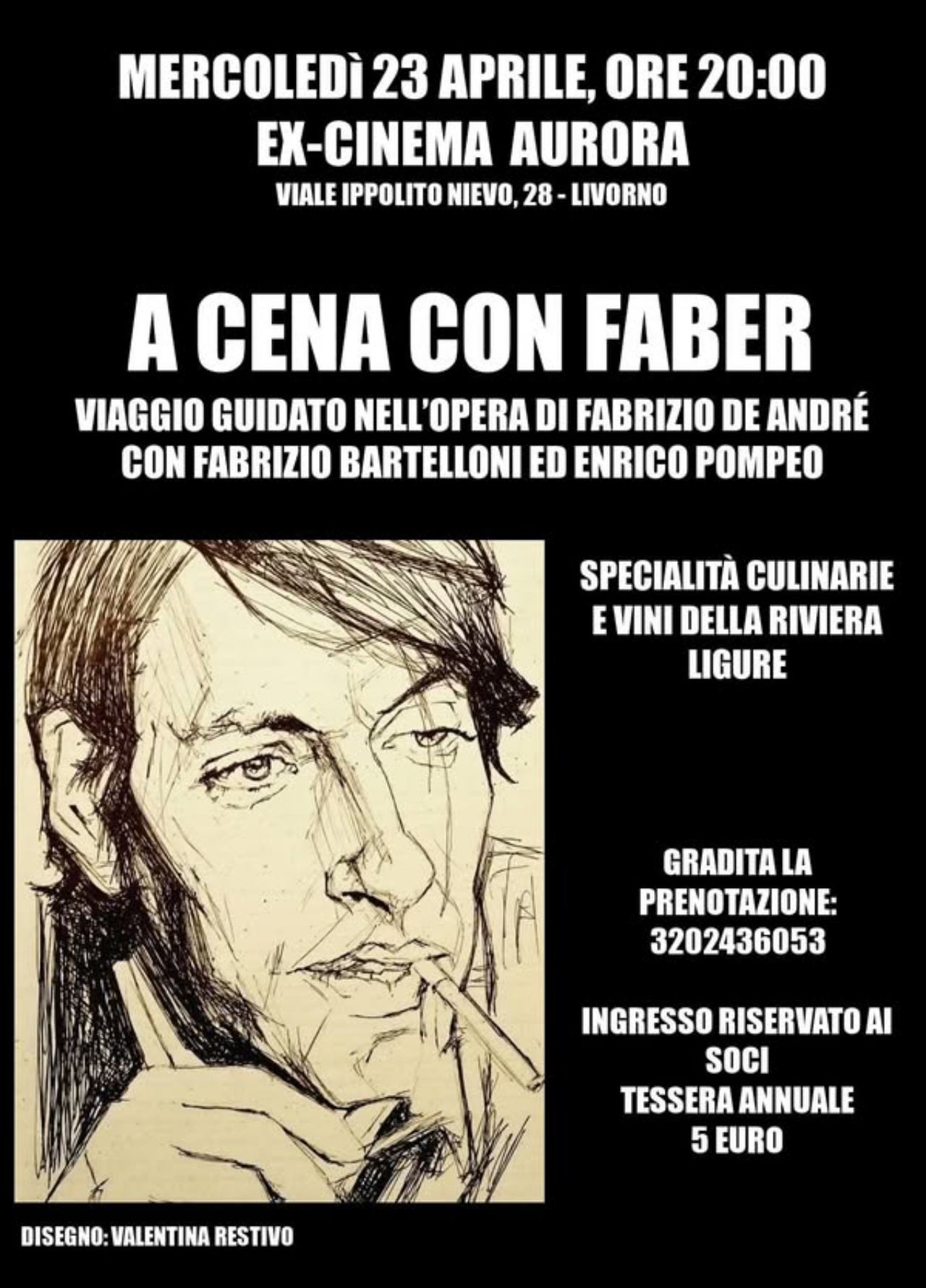 Mercoledì 23 aprile all’ex Cinema Aurora un viaggio guidato nell’opera di Fabrizio De André con musica, foto e aneddoti accompagnati dalla cucina e dai vini della Liguria