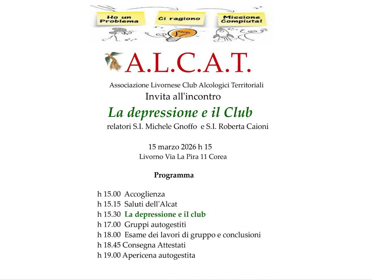 Domenica 15 marzo dalle ore 15,00 in via Giorgio La Pira 11 Un momento di riflessione e confronto su un tema delicato e sempre più diffuso come la depressione. Domenica 15 marzo, a partire dalle ore 15, si terrà a Livorno, in via La Pira 11 nel quartiere Corea, un incontro promosso da ALCAT Livorno…