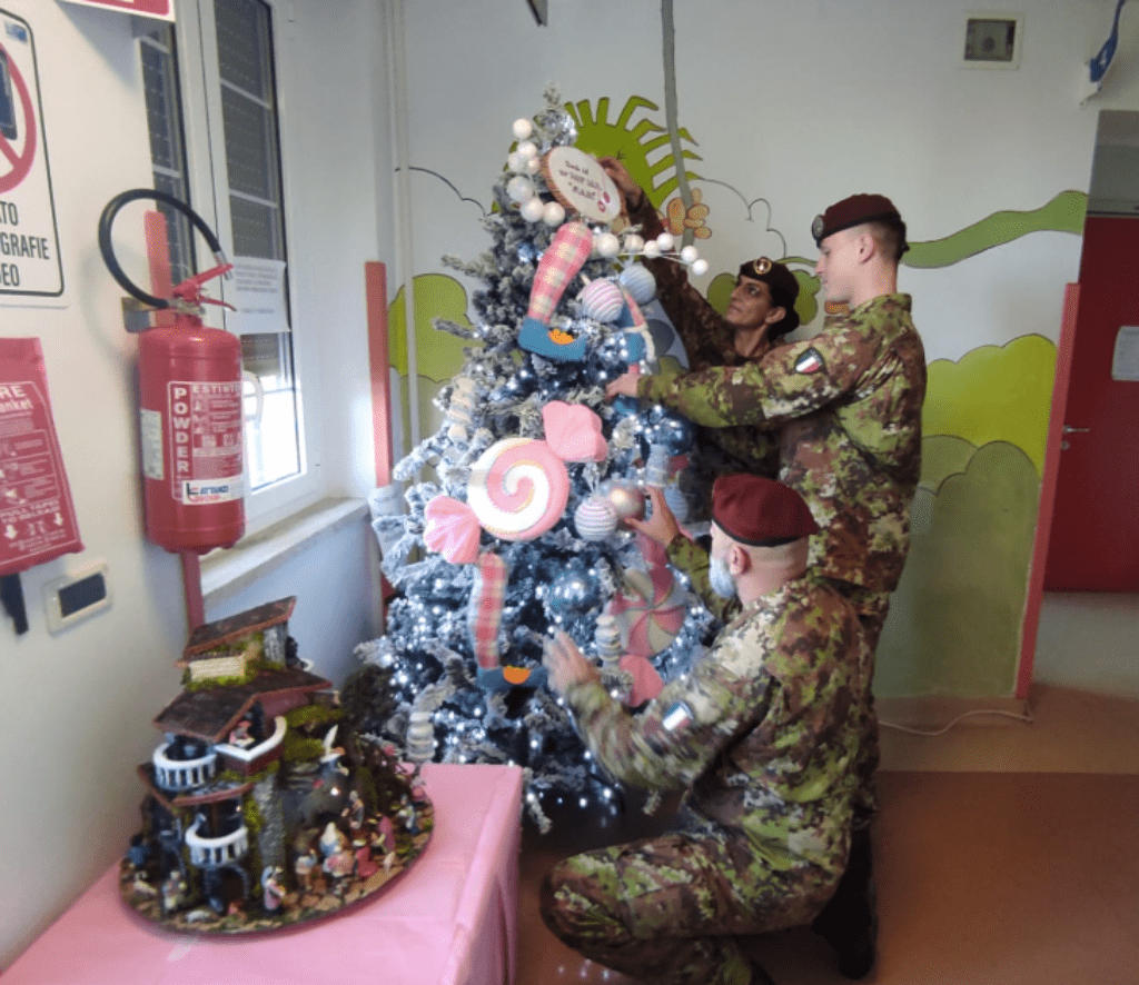 In occasione dell’incontro, i militari hanno donato e allestito un albero di Natale destinato ai piccoli pazienti, un gesto che ha portato un segno tangibile di vicinanza e attenzione in un periodo dell’anno particolarmente sensibile